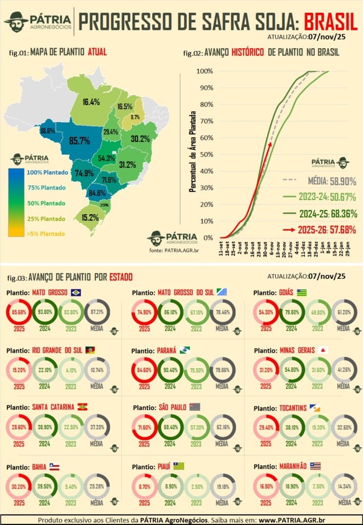 Segundo a consultoria Pátria Agronegócios, até o momento, 57,68% da área prevista para soja no Brasil em 2025 já foi plantada. No mesmo período de anos anteriores, os percentuais eram de 68,36% em 2024, 50,67% em 2023, e a média dos últimos cinco anos é de 58,90%.