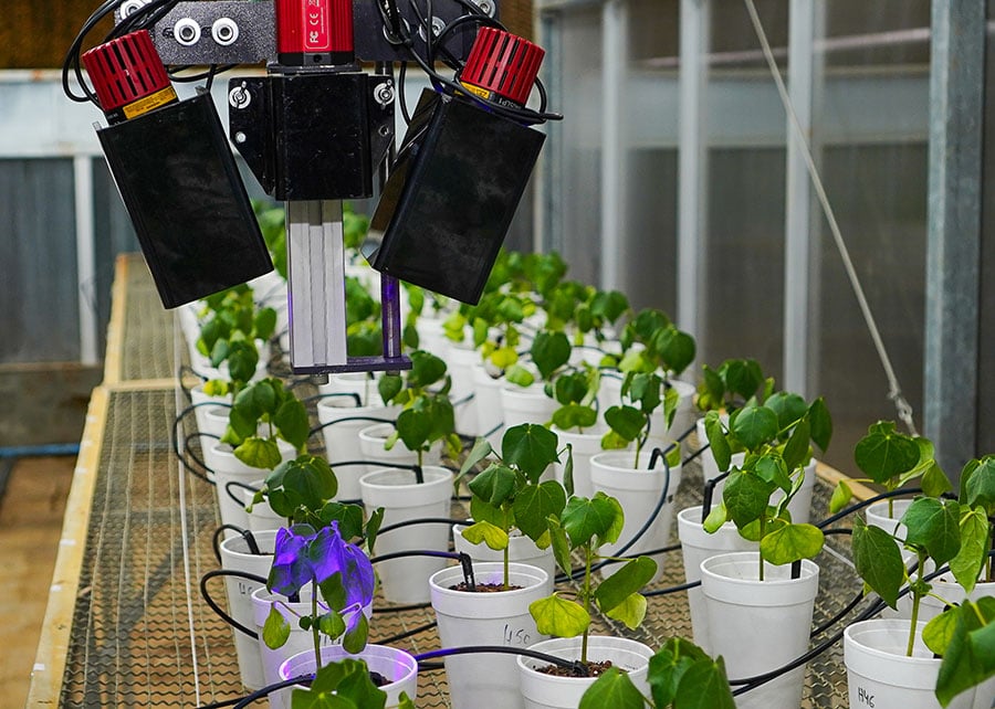 O LumiBot se desloca por trilhos entre as fileiras de algodão, avaliando cada folha e armazenando os dados em dispositivos externos para análise posterior.