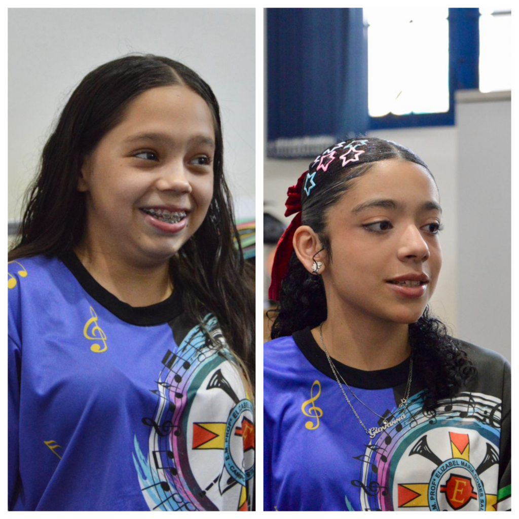 Ao lado de Maria Raffaella, Giovana Mara, de 11 anos, do 6º ano, e Gabriele, de 13 anos, do 8º ano, compartilham a mesma empolgação. Giovana toca trompete e entrou no projeto influenciada pela família e amigas. “Minha tia fazia e minhas amigas me chamaram. Agora, toda apresentação tem plateia: meus pais, minha tia. Eles ficam orgulhosos de me ver participar e tocar”, diz.