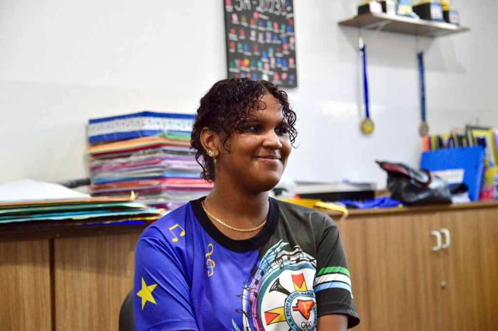 “Já vinha de uma escola que tinha fanfarra e achei que aqui não ia ter banda. Fiquei com medo. Pensei: ‘Meu Deus, vou chegar numa escola nova e não vou poder fazer algo que gosto tanto’. Quando me disseram que tinha, uma felicidade imensa subiu! Fiquei muito feliz e prometi para mim mesma que ia continuar até o fim do ano”, conta, com brilho nos olhos.