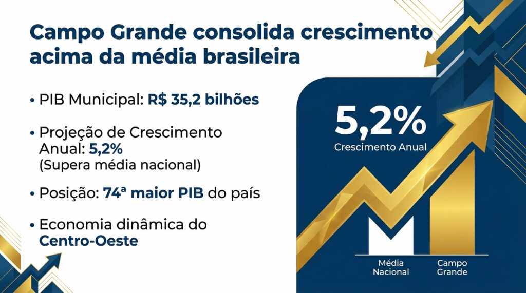 O Produto Interno Bruto (PIB) da Capital cresceu 5,2% em 2025, desempenho superior à média nacional. O avanço foi impulsionado, principalmente, pelo setor de serviços, pela indústria e pela força do agronegócio, consolidando Campo Grande como motor econômico de Mato Grosso do Sul.