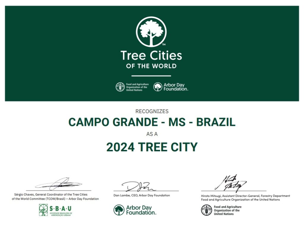 Campo Grande conquistou o título de capital mais arborizada do Brasil e recebeu, pela sexta vez consecutiva, o selo Tree City of the World, da Arbor Day Foundation em parceria com a FAO/ONU, em razão da boa gestão de sua arborização, reforçando o compromisso da Prefeitura com políticas públicas voltadas à sustentabilidade urbana.
