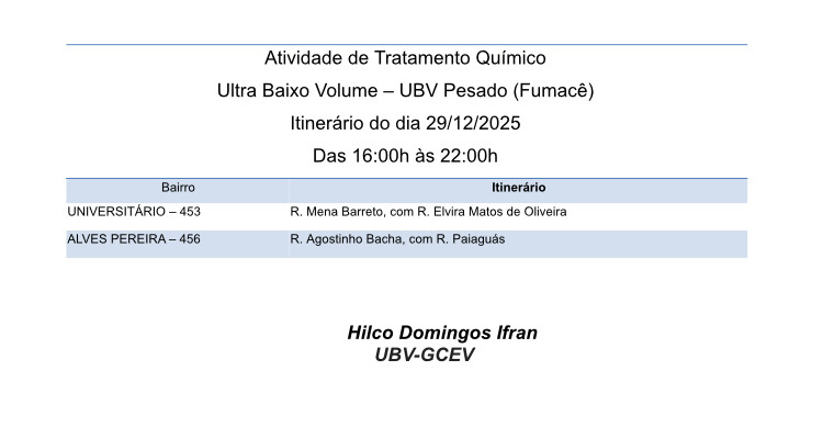 As equipes da Gerência de Controle de Endemias Vetoriais (GCEV) da Secretaria Municipal de Saúde (Sesau) circularão das 16h às 22h pelas ruas dos bairros Alves Pereira e Universitário.