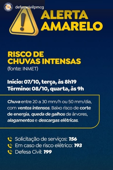 A Defesa Civil Municipal de Campo Grande informa que o Instituto Nacional de Meteorologia (INMET) emitiu Alerta Amarelo para risco de chuvas intensas na Capital. O aviso meteorológico para risco de tempestade tem início às 8h19 desta terça-feira (07/10) e segue até às 9h de quarta-feira (08/10).