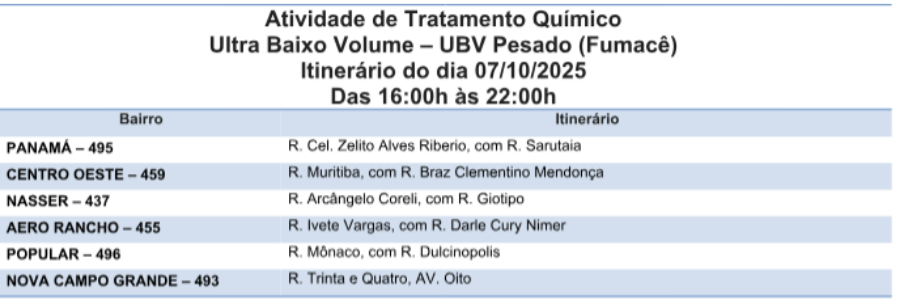 As equipes da Coordenadoria de Controle de Endemias Vetoriais (CCEV) da Secretaria Municipal de Saúde (Sesau) circularão das 16h às 22h, passarão pelos bairros: Jardim Panamá, Centro Oeste, Vila Nasser, Aero Rancho, Vila Popular e Nova Campo Grande.