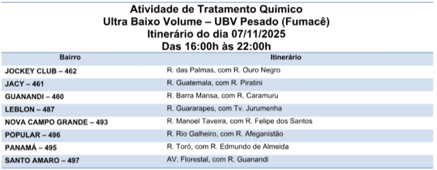 As equipes da Coordenadoria de Controle de Endemias Vetoriais (CCEV) da Secretaria Municipal de Saúde (Sesau) circularão das 16h às 22h pelas ruas dos seguintes bairros: Jockey Club, Vila Jacy, Guanandi, Jardim Leblon, Nova Campo Grande, Vila Popular, Jardim Panamá e Santo Amaro.