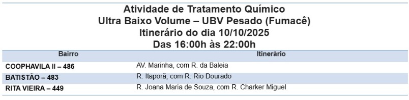 As equipes da Coordenadoria de Controle de Endemias Vetoriais (CCEV) da Secretaria Municipal de Saúde (Sesau) circularão das 16h às 22h pelas ruas dos seguintes bairros: Coophavila II, Batistão e Rita Vieira.