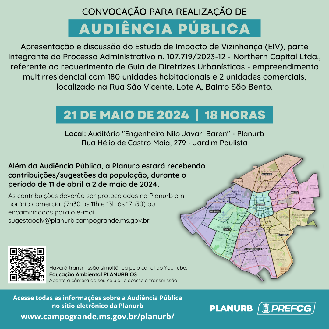 A Prefeitura de Campo Grande, por intermédio da Agência Municipal de Meio Ambiente e Planejamento Urbano (Planurb), realiza nesta terça-feira (21), às 18h, a Audiência Pública que apresentará e discutirá o Estudo de Impacto de Vizinhança (EIV), referente ao empreendimento multirresidencial com 180 unidades habitacionais e 2 unidades comerciais – Northern Capital Ltda., localizado na Rua São Vicente, Lote A, Bairro São Bento – Processo Administrativo 107.719/2023-12.