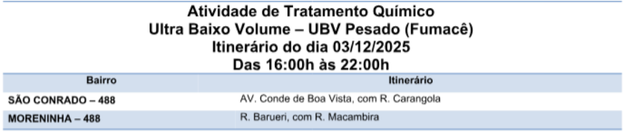 As equipes da Coordenadoria de Controle de Endemias Vetoriais (CCEV) da Secretaria Municipal de Saúde (Sesau) circularão das 16h às 22h pelas ruas dos seguintes bairros: São Conrado e Moreninha.