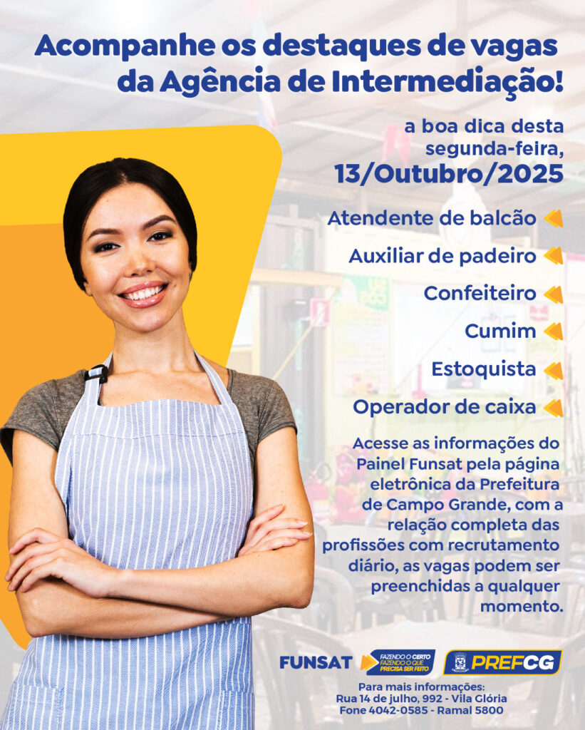 A semana começa movimentada na Fundação Social do Trabalho (Funsat), que abre as portas às 7h desta segunda-feira (13), com 1.494 vagas de emprego em 154 profissões diferentes. As oportunidades são ofertadas por 191 empresas de Campo Grande.
