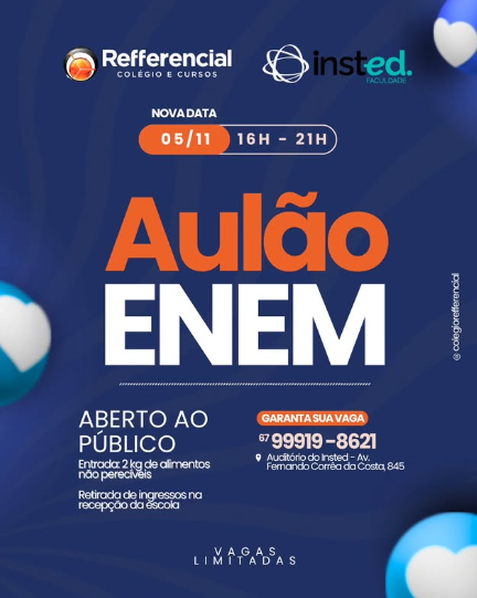 O Colégio Refferencial promove nesta quarta-feira (5), das 16h às 21h, o Aulão ENEM 2025, no auditório da Faculdade Insted, em Campo Grande. O evento é gratuito e aberto ao público, com entrada mediante a doação de 2 quilos de alimentos não perecíveis. Os ingressos devem ser retirados na recepção da escola, e as vagas são limitadas.