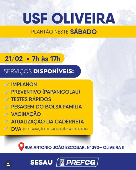 O atendimento acontece na USF Oliveira, localizada na Rua Antônio João Escobar, nº 390, no bairro Oliveira II. A orientação é que os moradores compareçam com documento pessoal, cartão do SUS e caderneta de vacinação, quando houver. A expectativa é de grande procura ao longo do sábado, especialmente pelos serviços de vacinação e saúde feminina.