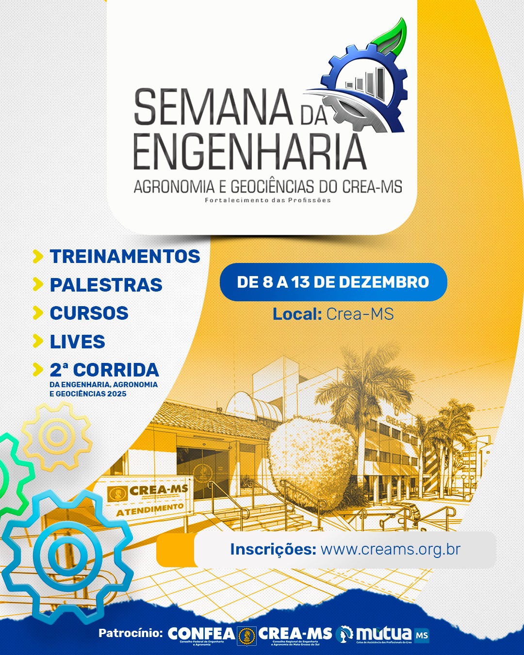 De 8 a 13 de dezembro, o Crea-MS realiza a Semana da Engenharia, Agronomia e Geociências de Mato Grosso do Sul. A programação marca o Dia do Engenheiro (11/12) e os 46 anos do Conselho (13/11) e conta com atividades gratuitas que incluem palestras, cursos, live, corrida e plantio de árvores. Os participantes podem doar um litro de leite, que será encaminhado a instituições assistenciais.