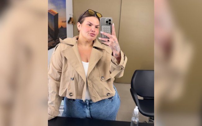 A influenciadora anunciou que deixou o manequim 66 e agora veste calça tamanho 54, mudança que considera uma de suas maiores conquistas no processo.