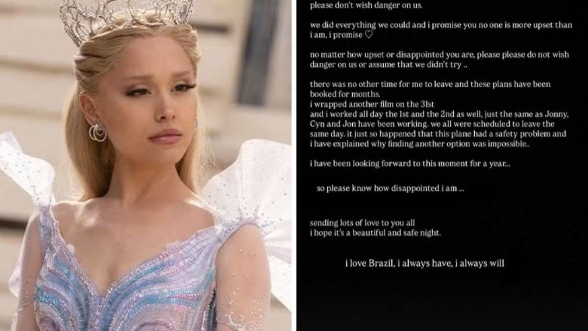 Ariana Grande lamentou nesta terça-feira (4) o cancelamento da viagem ao Brasil por causa de problemas técnicos na aeronave que traria o elenco do filme Wicked: For Good para a première em São Paulo. A cantora pediu compreensão dos fãs e explicou que a decisão foi tomada por motivos de segurança.