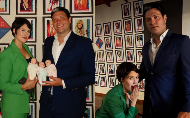 Já Caio reproduziu a clássica mecha grisalha de Bonner. Para completar, os dois seguravam bonecos representando os trigêmeos frutos do casamento dos jornalistas, a própria Bia, Vinícius e Laura.