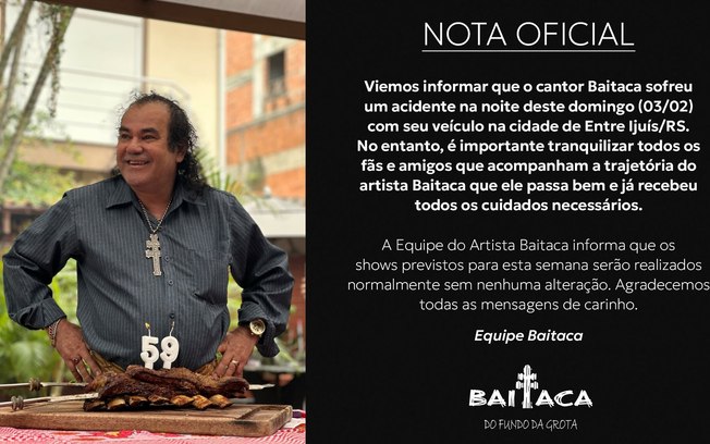 “Viemos informar que o cantor Baitaca sofreu um acidente na noite deste domingo (03/02) com seu veículo na cidade de Entre ljuís/RS. No entanto, é importante tranquilizar todos os fãs e amigos que acompanham a trajetória do artista Baitaca que ele passa bem e já recebeu todos os cuidados necessários. A Equipe do Artista Baitaca informa que os shows previstos para esta semana serão realizados normalmente sem nenhuma alteração. Agradecemos todas as mensagens de carinho.”