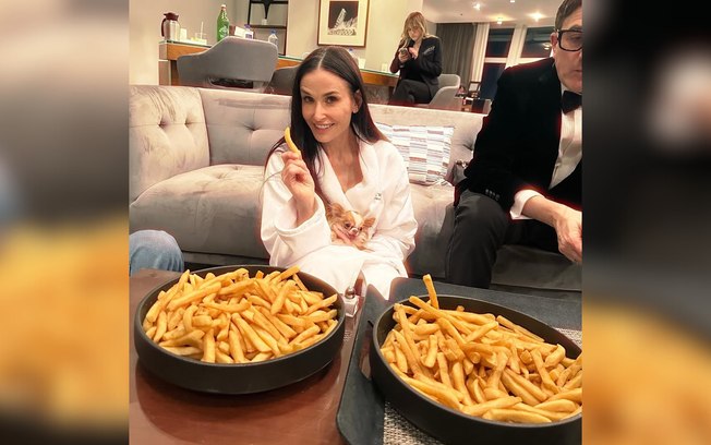 Em um registro feito por sua filha, Tallulah Willis, a atriz aparece sentada no chão, com seu cachorrinho no colo e saboreando batatas fritas.