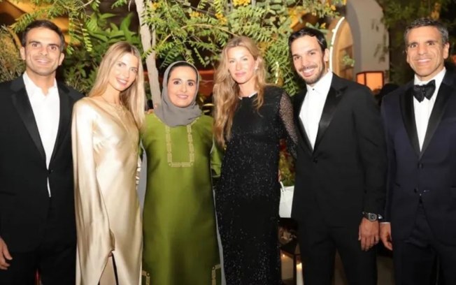 Na imagem, Gisele aparece ao lado de Joaquim, dos cunhados Pedro Valente e Gui Valente e de Laura, esposa de Gui. A organizadora do evento, Al Mayassa, também posou com o grupo. A modelo resumiu a noite com a legenda: “Noite linda”.