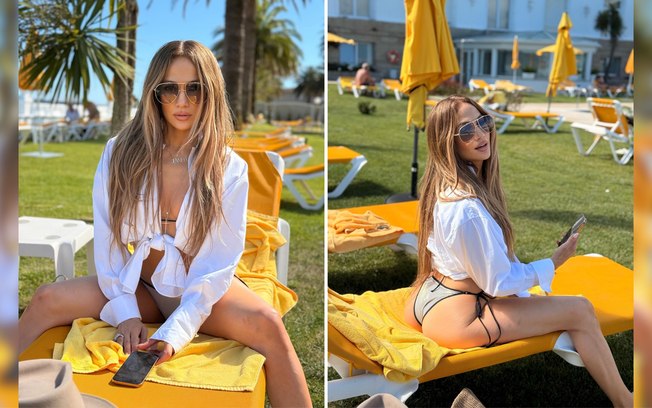 Em registros compartilhados nas redes sociais, a cantora aparece de biquíni fio-dental, deitada ao sol.