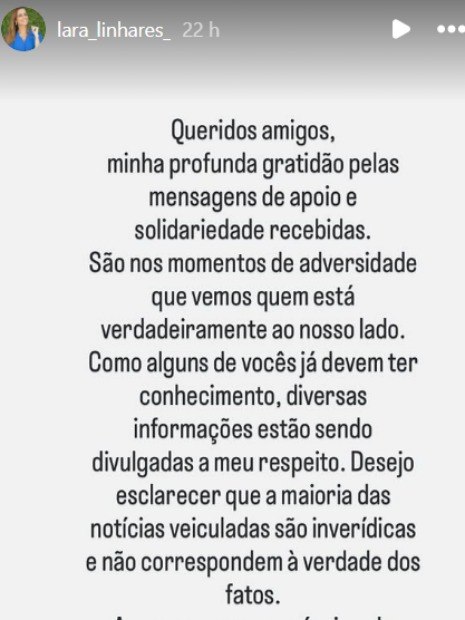 “Queridos amigos, minha profunda gratidão pelas mensagens de apoio e solidariedade recebidas. São nos momentos de adversidade que vemos quem está verdadeiramente ao nosso lado. Como alguns de vocês já devem ter conhecimento, diversas informações estão sendo divulgadas ao meu respeito. Desejo esclarecer que a maioria das notícias veiculadas são inverídicas e não correspondem à verdade dos fatos”, inicia.