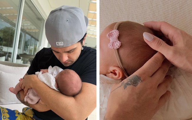 O cantor compartilhou momentos especiais ao lado da bebê, incluindo uma foto em que aparece ninando a pequena no colo e outra em que faz carinho em sua cabeça ao lado da amada – ambas sem revelar o rosto da criança.