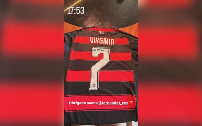 No dia da final da Copa Libertadores entre Flamengo e Palmeiras, Virginia Fonseca entrou de vez no clima da decisão depois de ganhar uma camisa do Rubro-Negro personalizada com seu nome e o número 7, presente enviado por Fernanda Cristina, mãe de Vini Jr., atual namorado da influenciadora.