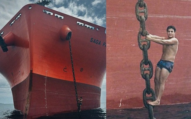 O adolescente compartilhou um post em que aparece pendurado em uma corrente de um navio ancorado na orla de Salvador. A peça de ferro do cargueiro tem mais de 30 metros de altura.