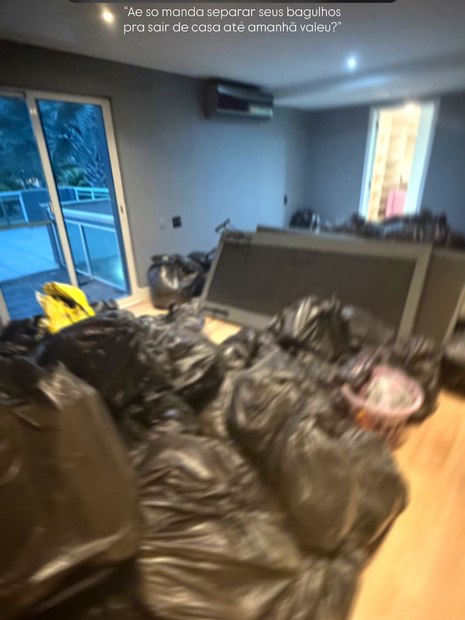 Nos stories Vivi mostra uma foto de sacos pretos cheios e a seguinte mensagem: “Ae só mandar separar seus bagulhos que pra sair de casa até amanhã, valeu?!” Em seguida, ela aparece arrumando duas coisas em outra casa.