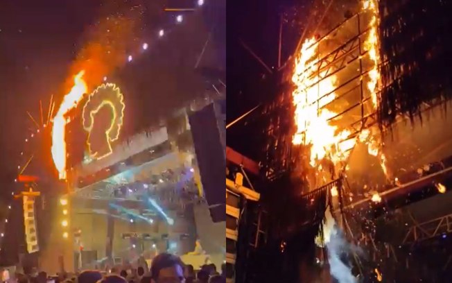 Em vídeos que circulam nas redes sociais, é possível ver o fogo se alastrando pelo palco e pessoas da equipe tentando apagar o incêndio com extintores. Veja abaixo: