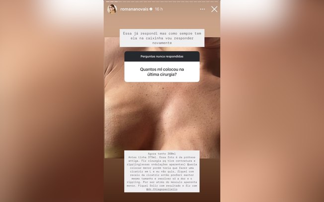 A médica e influenciadora Romana Novais, de 34 anos, usou suas redes sociais para responder perguntas enviadas por seguidores em uma caixinha com o tema “Perguntas nunca respondidas”.