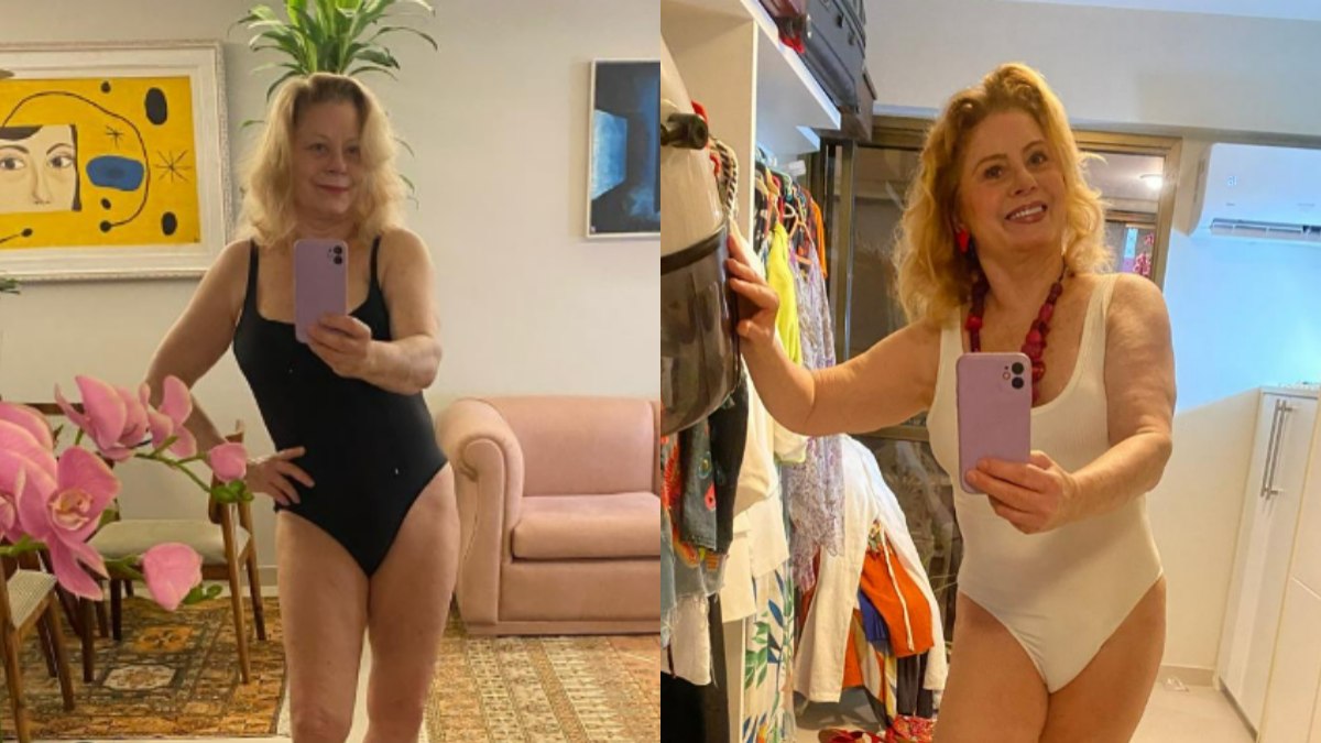 A atriz Vera Fischer, de 73 anos, chamou a atenção dos internautas nas redes sociais na última quarta-feira (1º) ao postar novas selfies em frente ao espelho. Nas imagens, a artista aparece usando um maiô bicolor, branco e preto, e chegou até a brincar com seus seguidores.