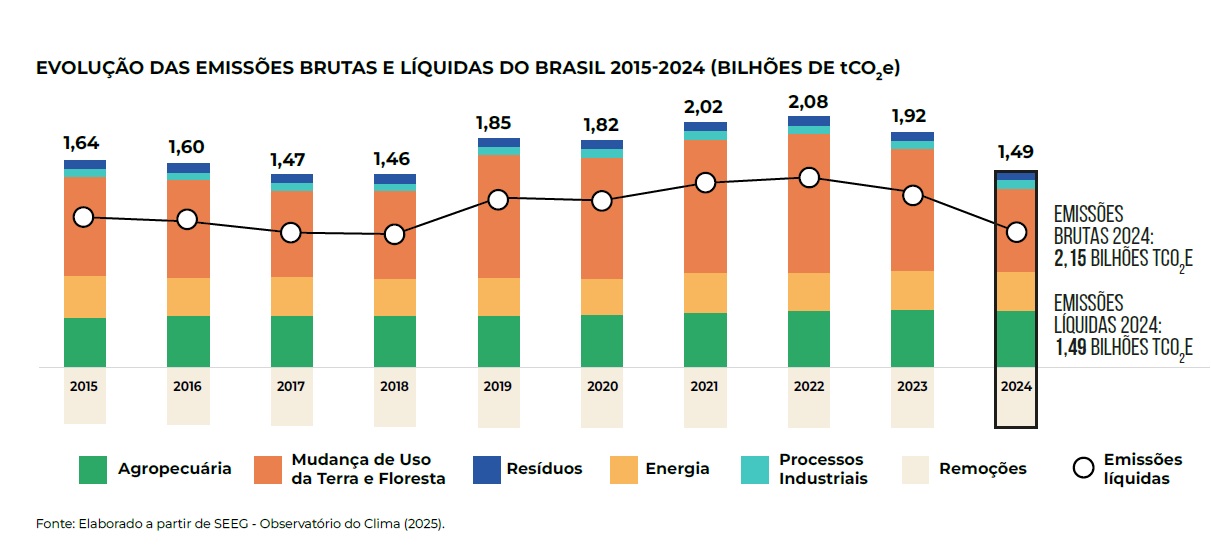 Com relação às emissões, houve redução significativa no volume de gases causadores do Efeito Estufa liberados na Atmosfera em todo País. Foram 1,49 bilhões de toneladas de dióxido de carbono equivalente em 2024, enquanto em 2023 esse volume chegou a 1,92 bi/ton e no ano anterior, 2,08 bi/ton. Só a região Sudeste não apresentou redução nas emissões. Entre as atividades com as maiores emissões está a Agropecuária.