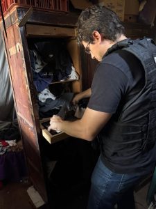 Durante o cumprimento da diligência, foram realizadas buscas no endereço vinculado ao investigado, com o objetivo de localizar armas, munições e outros objetos de interesse para a investigação.