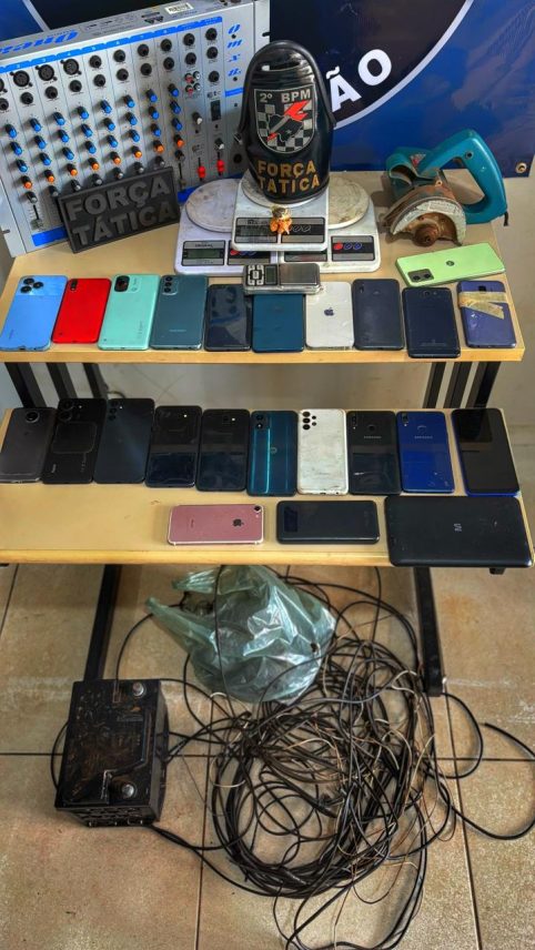 Durante a busca no imóvel os policiais vieram a localizar 2 “pedras” de crack (pesando 5 gramas), 1 “porção” de maconha (pesando 2,2 gramas), 4 balanças de precisão, e produtos sem comprovação de origem lícita, dentre eles: 22 aparelhos celulares; 1 mesa de som; 1 serra tipo “makita”; 1 quadro de bicicleta elétrica; 1 bateria veicular 45A