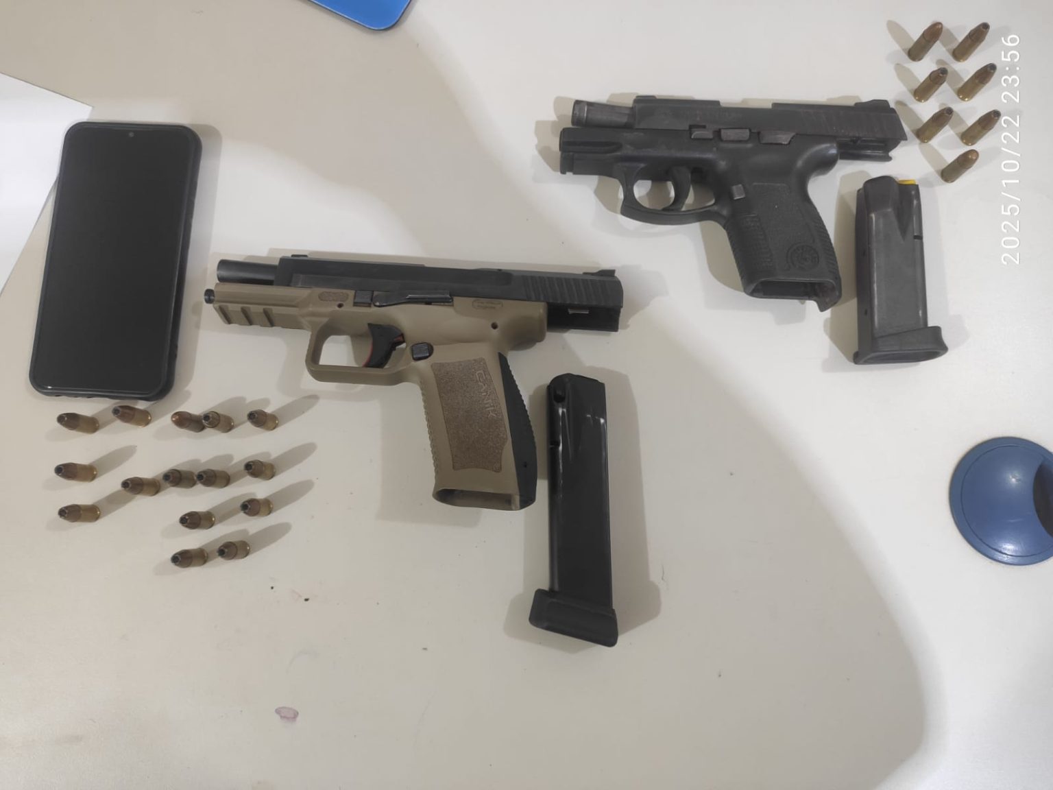 Durante a revista, os investigadores encontraram com W.V.F.R. duas pistolas 9mm — uma da marca Taurus, com número de série aparente, e outra da marca Canik, com a numeração suprimida. Também foram apreendidas 22 munições e um aparelho celular.
