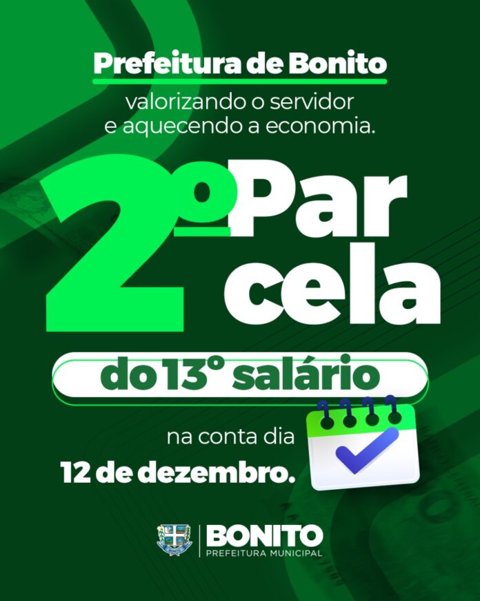 A Prefeitura de Bonito, por meio da Secretaria de Administração e Finanças, realiza nesta sexta-feira (12) o pagamento da segunda parcela do 13º salário dos servidores públicos municipais, correspondente a 60% do valor total.
