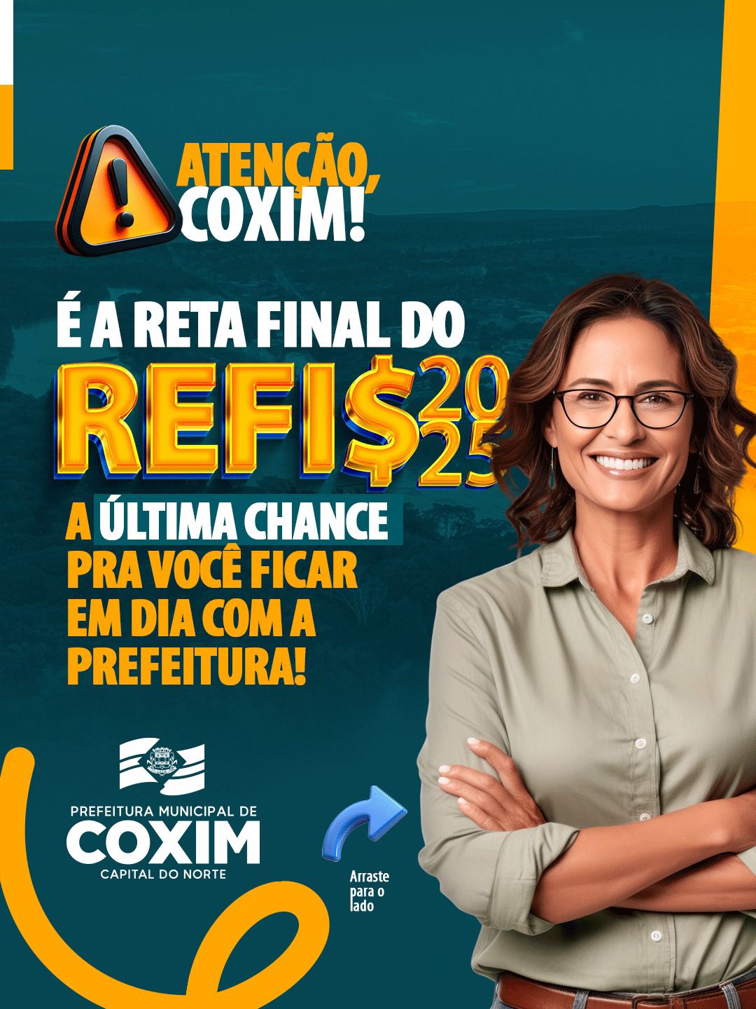 A Prefeitura de Coxim comunica à população que o prazo para adesão ao Programa de Recuperação Fiscal (REFIS) encerra na próxima semana, em 31 de outubro. O programa, regulamentado pela Lei n° 2.035, de 15 de julho de 2025, oferece condições únicas para a regularização de débitos de ISS, ISQN, IPTU e demais tributos municipais: até 100% de desconto sobre juros e multas e possibilidade de parcelamento em até 36 vezes, com condições especiais.