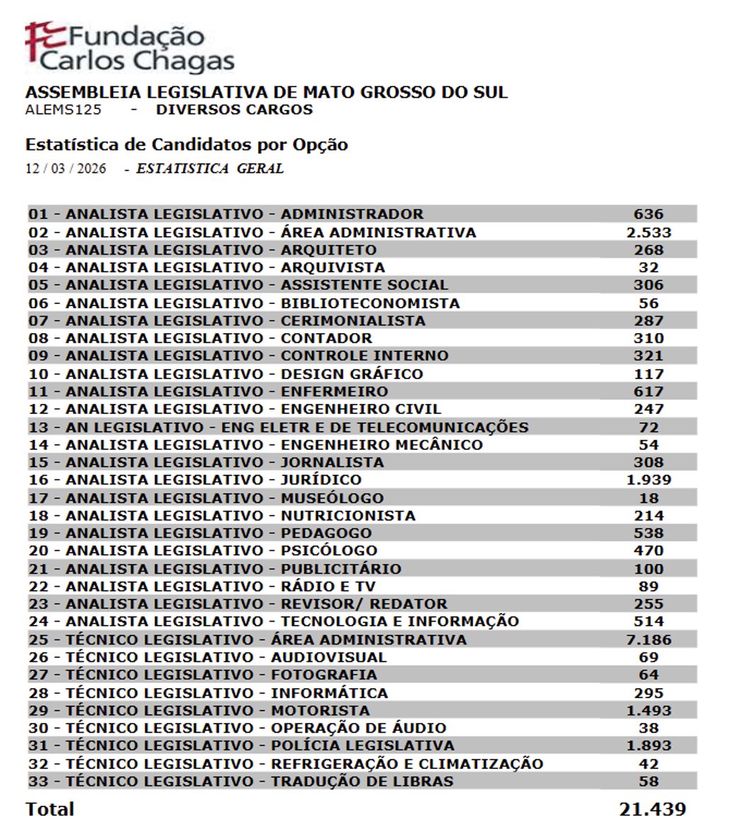A Fundação Carlos Chagas (FCC) divulgou que 21.439 pessoas se inscreveram para o II Concurso Público de Provas Para Provimento de Cargos na Assembleia Legislativa de Mato Grosso do Sul (ALEMS). O número revela um aumento de aproximadamente 18,8% a mais de inscritos no último certame, realizado em 2016, com um total de 18.040 concorrentes.