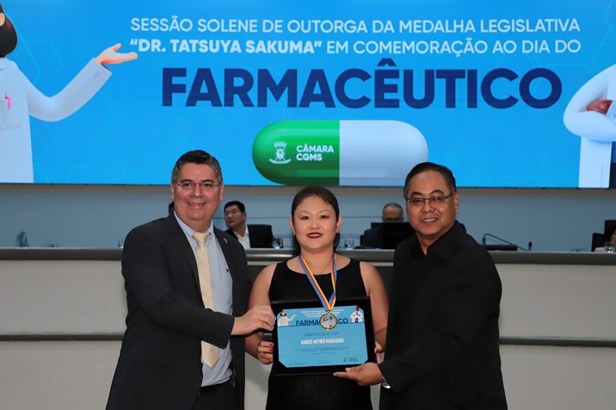 Na noite da quarta-feira (24), o vereador e presidente da Comissão de Saúde da Câmara Municipal de Campo Grande, Dr. Victor Rocha (PSDB), participou da Sessão Solene em homenagem aos farmacêuticos, realizada no Plenário Oliva Enciso. Na ocasião, ele prestou homenagem à farmacêutica Agnes Mitiko Harasaki, que recebeu a “Medalha Legislativa Dr. Tatsuya Sakuma” em reconhecimento à sua trajetória de dedicação à saúde pública em Mato Grosso do Sul.