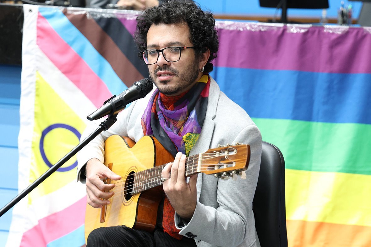 O reconhecimento do papel essencial da diversidade no exercício de suas profissões em Mato Grosso do Sul foi o motivo da sessão solene que reuniu, no Plenário Júlio Maia, o público LGBTQIAPN+ nesta noite de terça-feira (1º). O evento celebrou as trajetórias que transformam histórias e constroem o futuro para a promoção da cidadania e inclusão nos locais de trabalho. Proposta pelo deputado e 2º secretário da Assembleia Legislativa de Mato Grosso do Sul (ALEMS), Pedro Kemp (PT), a solenidade reforça a luta contra o preconceito, a violência e a discriminação, em alusão ao orgulho LGBTQIA+ e iniciou com a apresentação do multiartista Bèget de Lucena, que interpretou as músicas Balada de Gisberta, uma composição de Pedro Abrunhosa e Sussuarana, composta por Hekel Tavares e Luiz Peixoto.