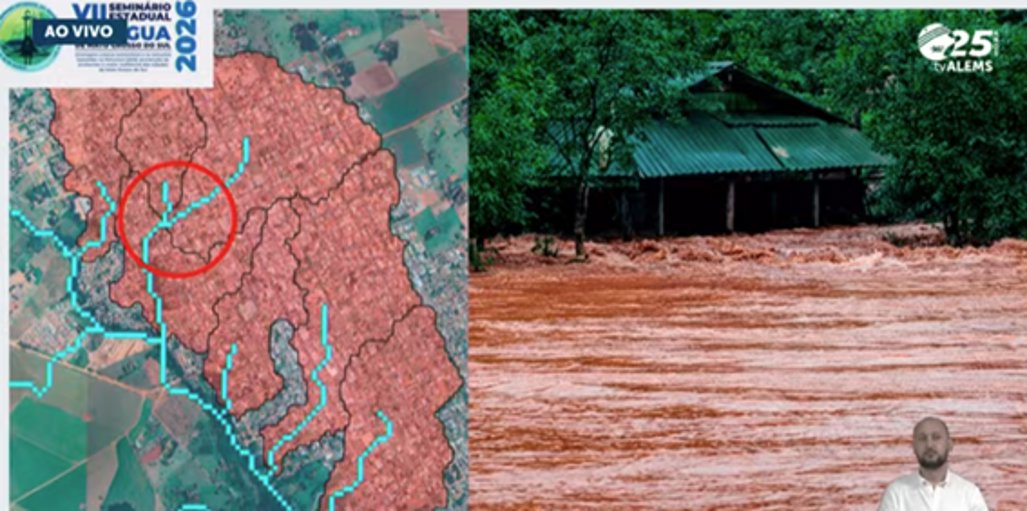 A terceira palestra do dia foi ministrada pelo prefeito de Amambaí, Sérgio Barbosa, que falou sobre a experiência de um gestor municipal. “Dificilmente você não vai encontrar um gestor que não tenha errado, mas que, como eu, persiste em continuar para sempre melhorar, por isso estou aqui. Em 2005 assumi pela primeira vez prefeito e teve uma chuva intensa, em que o Rio Panduí transbordou e levou a ponte, foi um caos. Em 2015, eu também assumi de volta a prefeitura e outra chuva fez estragos gigantes, quase todas as pontes do Rio Amambai foram levadas. Em 2025 assumi novamente e em meus 30 anos de Amambai nunca havia presenciado tanta chuva. Então mapeamos as nossas bacias em um geoportal junto aos universitários mostrando os pontos de alagamento, não apenas para um prefeito, mas para a cidade e as gestões. Ao longo dos anos fizeram pavimentações, sem todas as drenagens, mas infelizmente o dinheiro é limitado”, resumiu.