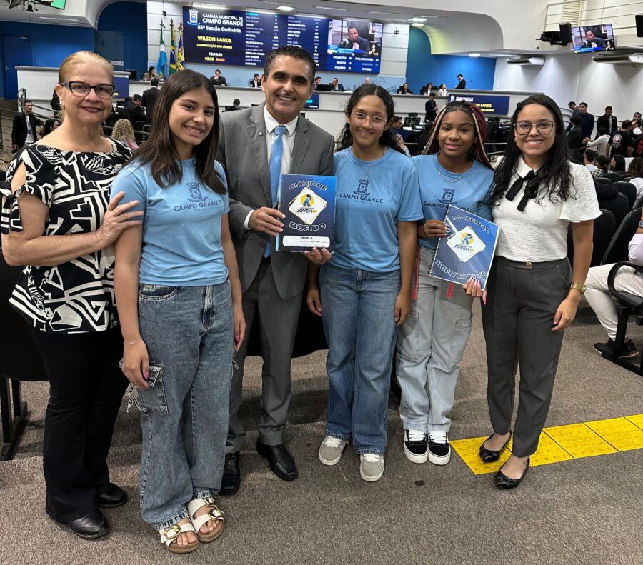 A manhã desta terça-feira (11) foi marcada por uma visita especial ao gabinete do vereador Herculano Borges, na Câmara Municipal de Campo Grande. O parlamentar recebeu com alegria um grupo de alunos da Escola Municipal Hércules Maymone, acompanhados da diretora Pamela, da coordenadora Célia e das estudantes Camille, Isabel e Ana Laura, participantes do projeto “Controladoria Jovem”.