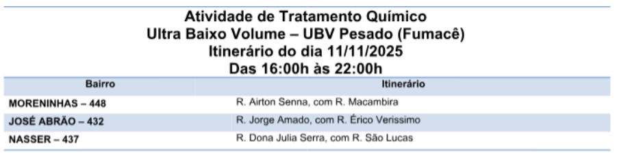 As equipes da Coordenadoria de Controle de Endemias Vetoriais (CCEV) da Secretaria Municipal de Saúde (Sesau) circularão das 16h às 22h pelas ruas dos seguintes bairros: Moreninhas, José Abrão e Vila Nasser.