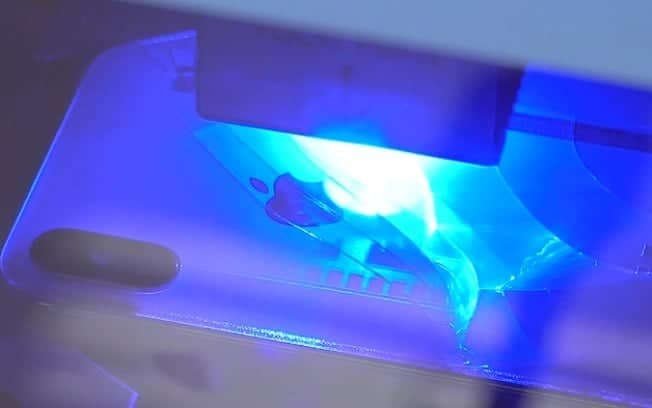 de luz azul para retirar o painel traseiro dos celulares, já que o laser passa pelo vidro do aparelho e derrete o composto que cola o componente na parte interior do dispositivo.