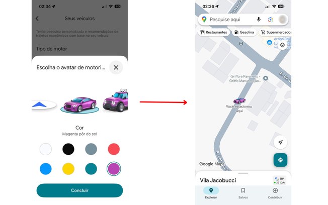 Outra novidade é que o local do estacionamento agora pode ser marcado com o mesmo ícone de carro personalizado escolhido pelo usuário no Google Maps. Desde 2020, o aplicativo permite alterar o símbolo do veículo, com diferentes formatos e cores.