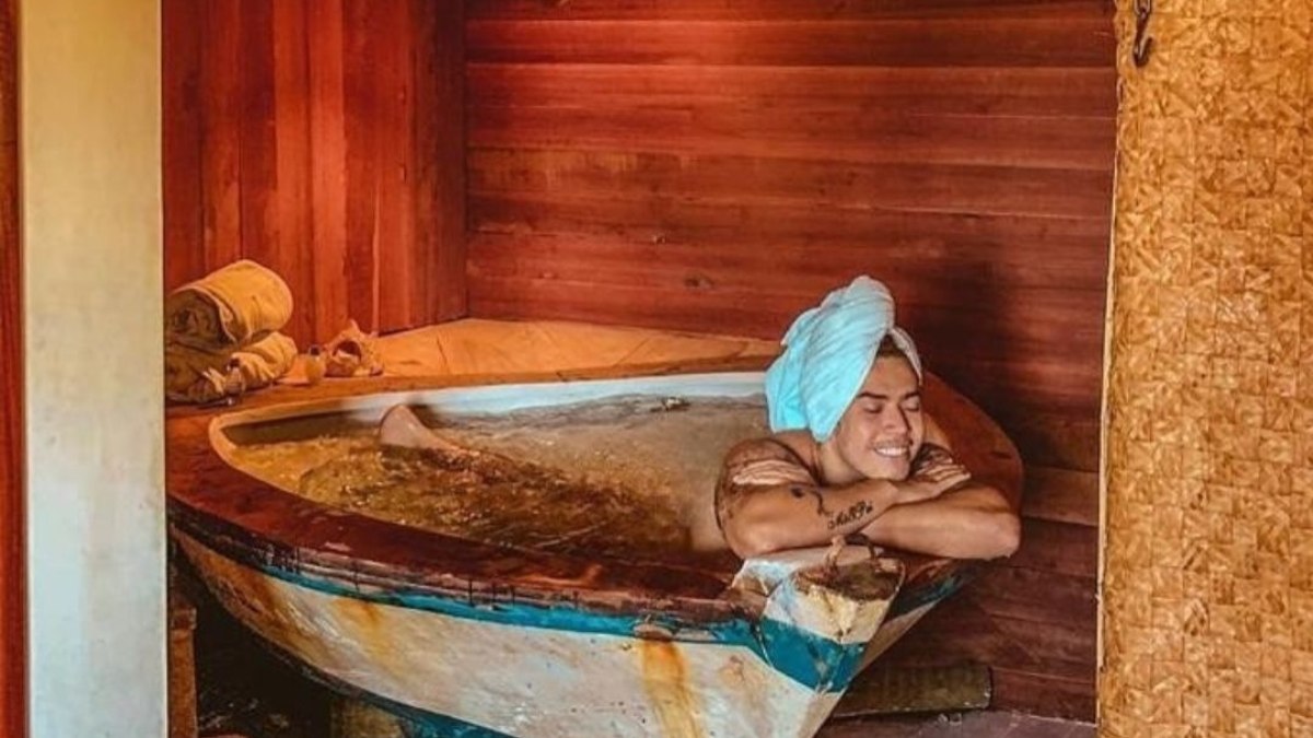 A Casa do Trazan e um bangalô rústico em madeira, com varanda ampla e área total de 45 metros quadrados. O local é indicado exclusivamente para casais, já que tem uma cama grande e banheira de hidromassagem em formato de barco.